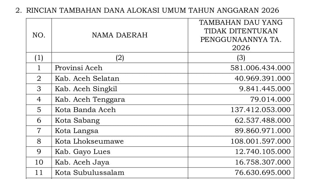 Hal ini diketahui saat Pemerintah pusat melalui Kementerian Keuangan Republik Indonesia resmi merilis rincian tambahan Transfer ke Daerah (TKD) tahun 2026 bagi wilayah terdampak bencana di Aceh dan Sumatera.